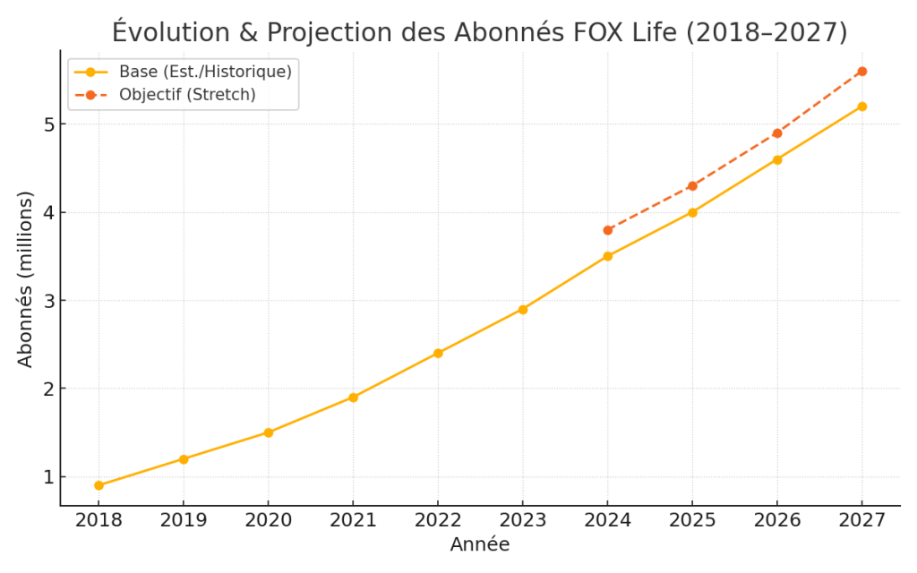 Évolution & projection des abonnés abonnés FOX Life (2018–2027) – estimations / objectif